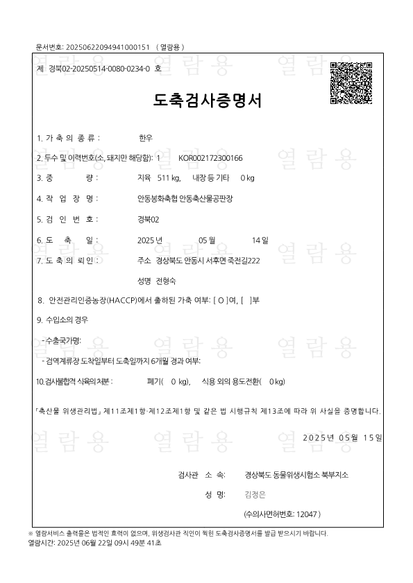 05월 26일 축산물 이력번호 조회