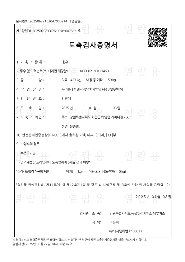 06월 18일 축산물 이력번호 조회